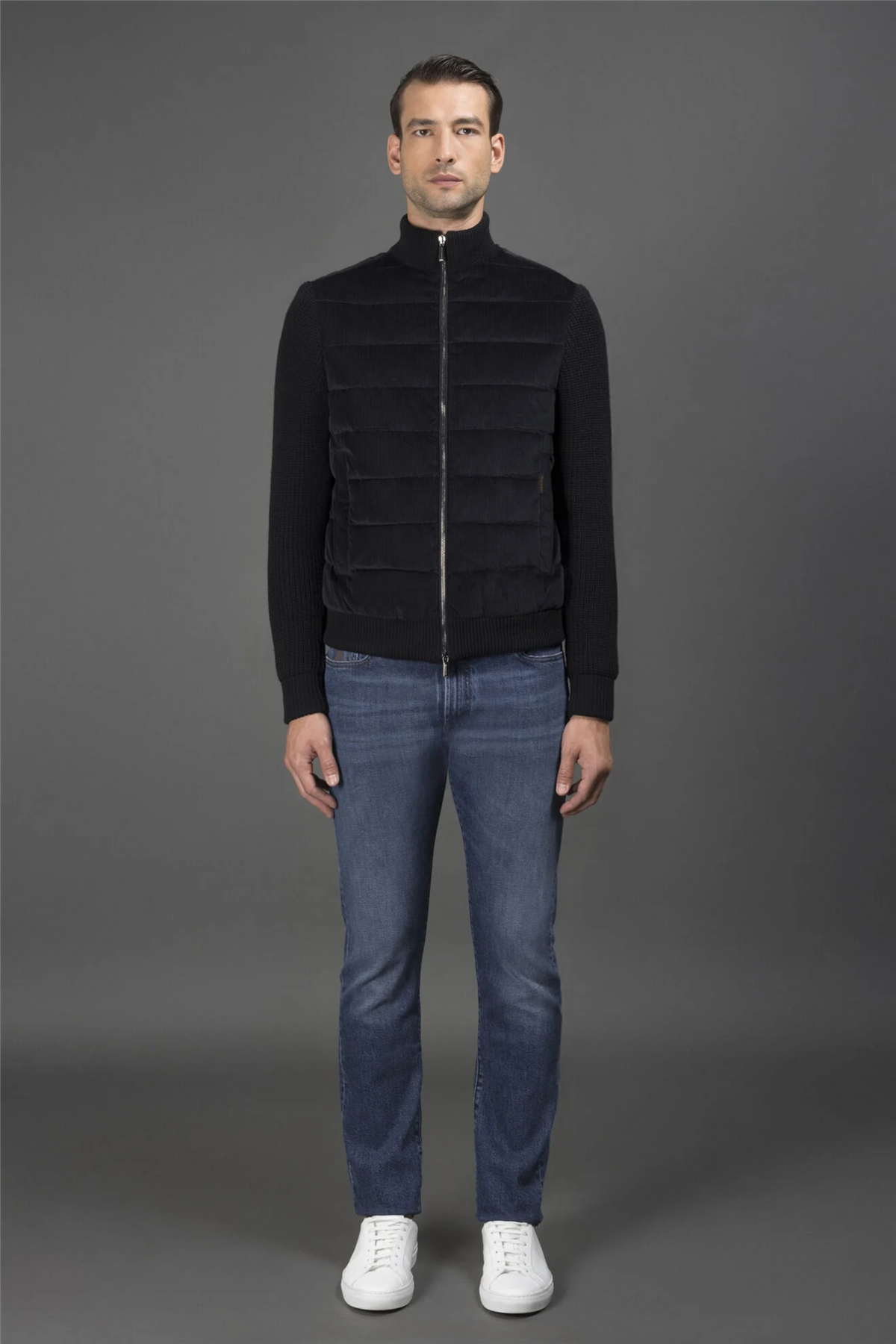 En eksklusiv hybrid-bomber fra MooRer, håndlaget i Italia og konstruert for å forene eleganse, varme og komfort. Kroppen er quiltet og fylt med dun for optimal isolasjon, mens fronten er kledd i en vertikal femlinjers bomullsfløyel med dyp glans. Ermene og nederkanten er strikket i en myk og luksuriøs ull– og kasjmirblanding, utført i en raffinert cob-stitch som gir en rik tekstur. En tidløs premiumjakke med funksjonelle detaljer og utsøkt italiensk håndverk – perfekt for deg som ønsker yttertøy i øverste sjikt.