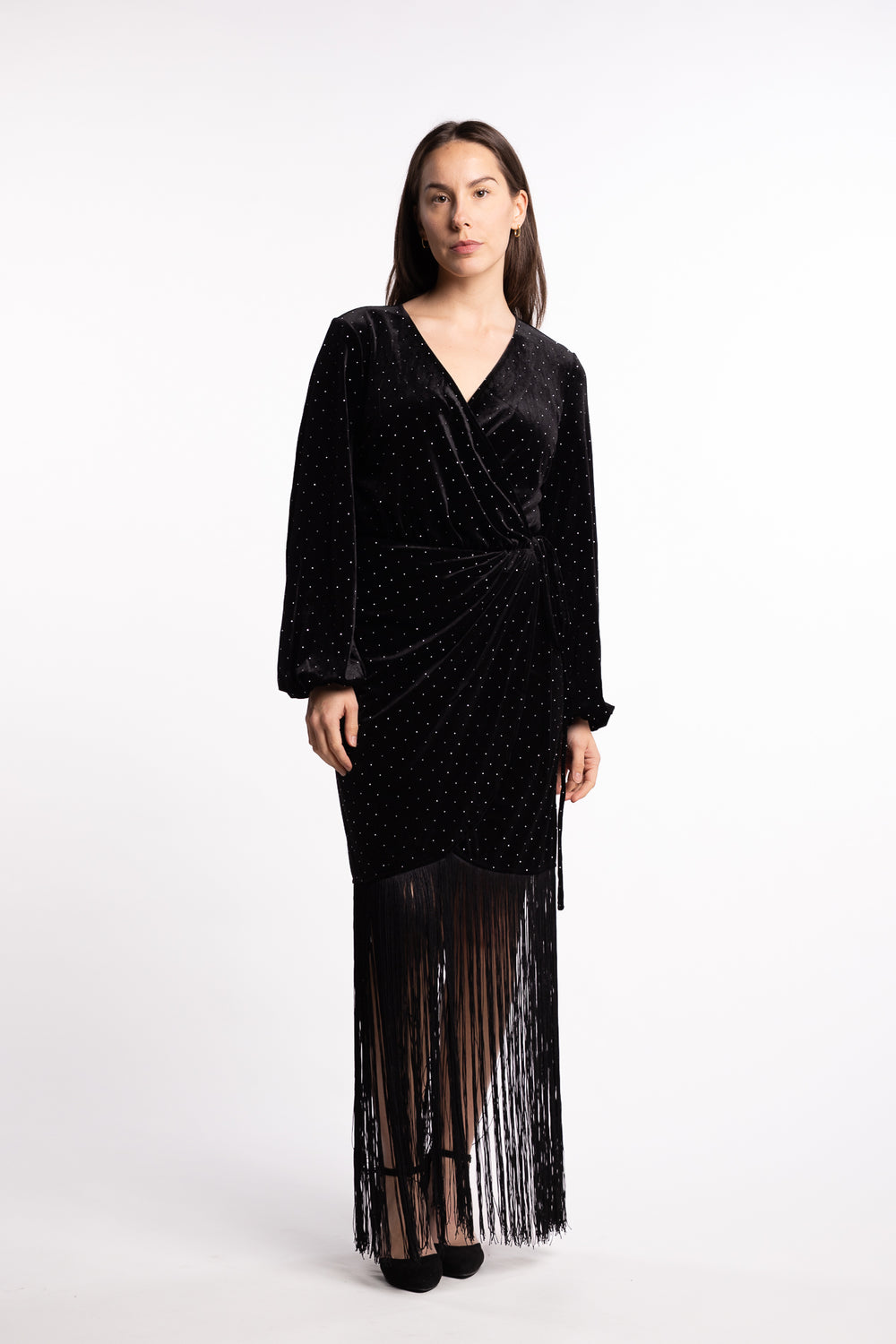 Sine Stud Velour Dress fra ella&il er en elegant midikjole i myk, elastisk velour som gir en flatterende silhuett. Kjolen har omslagssnitt med V-hals, lange puffede ermer og frynser langs kantene som tilfører et moderne preg. En tidløs modell med feminine detaljer – perfekt til både selskap og fest.