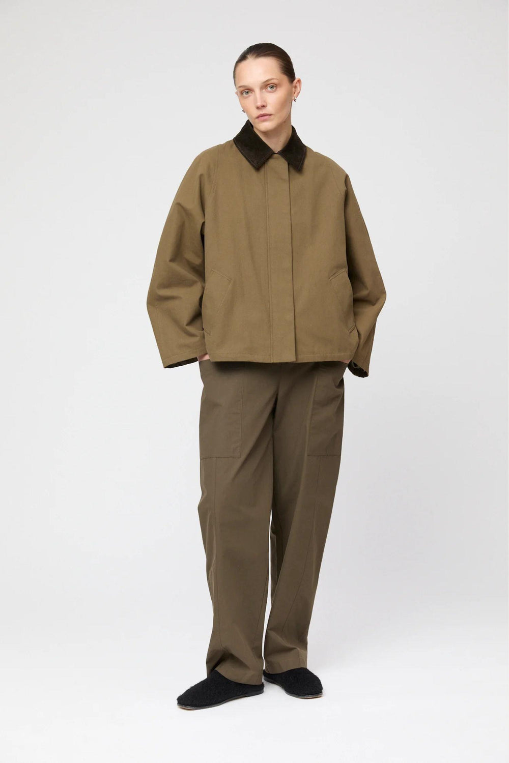 Barn Jacket fra FWSS er en kortere tolkning av den klassiske Long Hunting Jacket. Jakken er laget i slitesterk bomullscanvas med lett fôr, og kombinerer et funksjonelt uttrykk med tidløse workwear-referanser. Kontrastkrage i kordfløyel og praktiske frontlommer gir plagget karakter og anvendelighet i hverdagen.